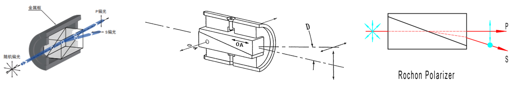 洛匈偏振棱镜由两个由双折射晶体制成的形状相同的棱镜光胶或者胶合而成。晶轴在一个棱镜中平行于传播方向,在另一个棱镜中与传播方向正交。由于折射率相同,o光和e光在第一个晶体棱镜中以o光的折射率no沿着光轴方向传播。当两束光进入第二个晶体棱镜中,o光还是以折射率no继续传播,e光则是以折射率ne进行传播,并在截面上产生折射。折射的角度在第二个晶体棱镜和空气中增加折射角,从而出射后的两束光形成一定角度的夹具。正是出于这个性能原理,洛匈偏振器特别适用于需要旋转偏振器的应用系统中,用于光信号偏振特性分析。